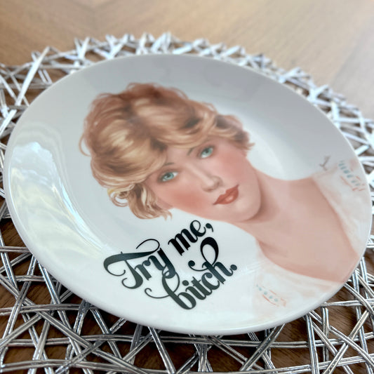 "Try Me, Bitch" | Handpainted Vintage Upcycled Plate | 9.5 in