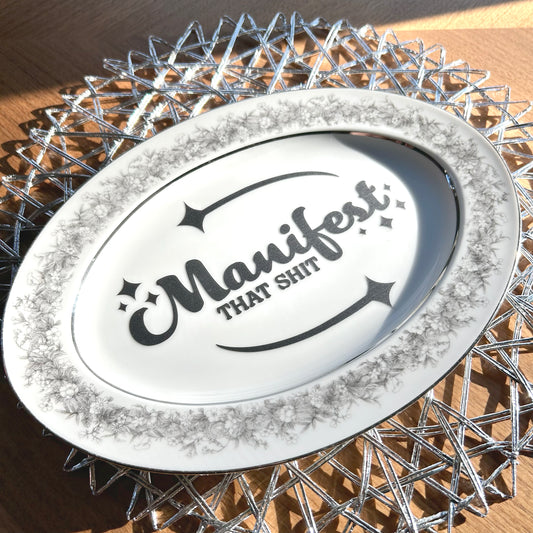 "Manifest That Shit" | Sassy Witchy Quote | Upcycled Vintage Decorative Platter | 12in Oval